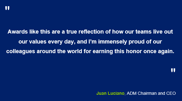 “ADM has a foundational culture of execution and innovation, but even more important is the unwavering commitment our colleagues to deliver our purpose to unlock the power of nature to enrich the quality of life,” said Chairman and CEO Juan Luciano.