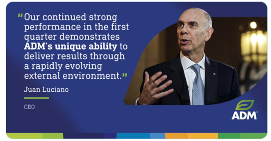 ADM Reports First Quarter Earnings per Share of $2.12, $2.09 on an Adjusted Basis