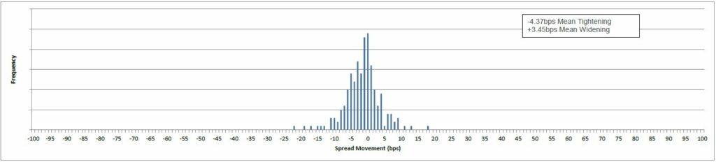 Of the 197 bonds (with price and spread data populated) in the performance table for the past month, 139 tightened and 58 widened. The mean tightening was -4bps and the mean widening was +3bps.