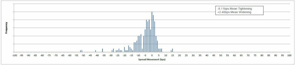 Of the 271 bonds (with price and spread data populated) in the performance table for the past month, 203 tightened and 68 widened. The mean tightening was -8bps and the mean widening was +2bps.