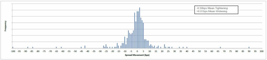 Of the 375 bonds (with price and spread data populated) in the performance table for the past month, 196 tightened and 179 widened. The mean tightening was –9bps and the mean widening was +6bps.