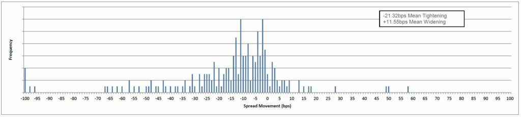 Of the 204 bonds (with price and spread data populated) in the performance table for the past month, 175 tightened and 29 widened. The mean tightening was -21bps and the mean widening was +12bps.
