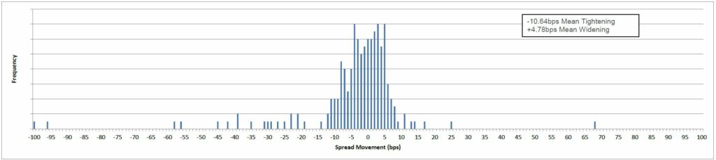 Of the 208 bonds (with price and spread data populated) in the performance table for the past month, 123 tightened and 85 widened. The mean tightening was -11bps and the mean widening was +5bps.