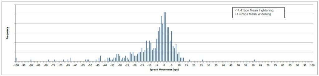 Of the 409 bonds (with price and spread data populated) in the performance table for the past month, 278 tightened and 131 widened. The mean tightening was -14bps and the mean widening was +5bps.