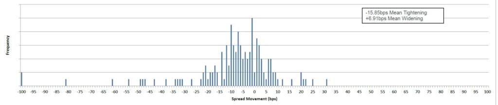 Of the 151 bonds (with price and spread data populated) in the performance table for the past month, 110 tightened and 41 widened. The mean tightening was -16bps and the mean widening was +7bps.