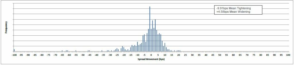 Of the 422 bonds (with price and spread data populated) in the performance table for the past month, 235 tightened and 187 widened. The mean tightening was -10bps and the mean widening was +5bps.