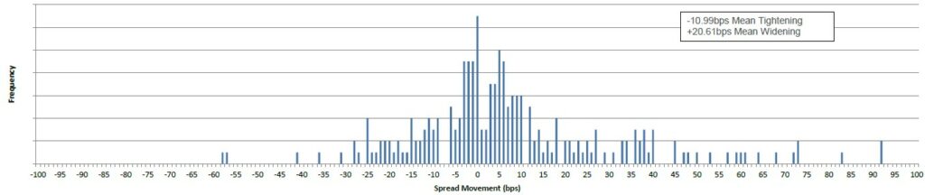 Of the 229 bonds (with price and spread data populated) in the performance table for the past month, 99 tightened and 130 widened. The mean tightening was -11bps and the mean widening was +21bps.