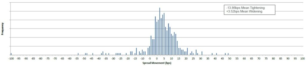 Of the 273 bonds (with price and spread data populated) in the performance table for the past month, 113 tightened and 271 widened. The mean tightening was -10bps and the mean widening was +8bps.
