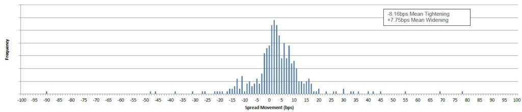 Of the 377 bonds (with price and spread data populated) in the performance table for the past month, 122 tightened and 255 widened. The mean tightening was -8bps and the mean widening was +8bps.
