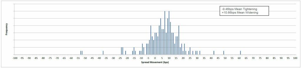 Of the 273 bonds (with price and spread data populated) in the performance table for the past month, 52 tightened and 145 widened. The mean tightening was -9bps and the mean widening was +11bps.