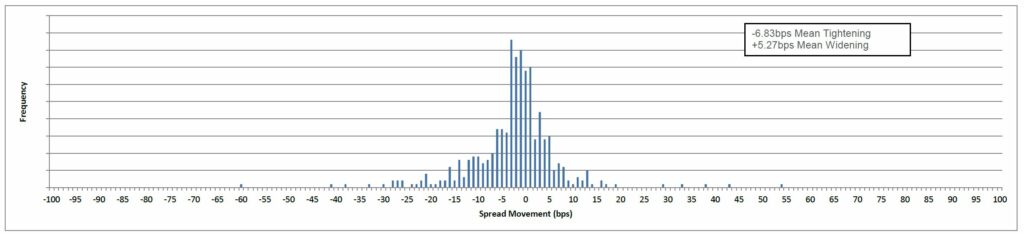 Of the 441 bonds (with price and spread data populated) in the performance table for the past month, 300 tightened and 141 widened. The mean tightening was -7bps and the mean widening was +5bps.