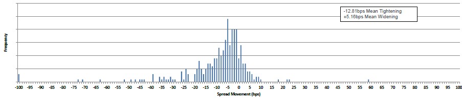 Of the 313 bonds (with price and spread data populated) in the performance table for the past month, 264 tightened and 49 widened. The mean tightening was -13bps and the mean widening was +5bps.