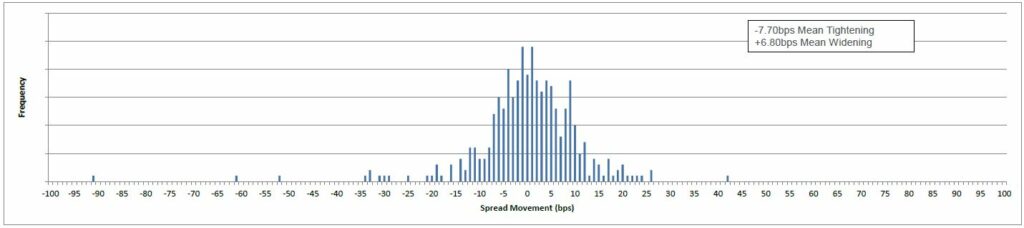 Of the 325 bonds (with price and spread data populated) in the performance table for the past month, 282 tightened and 43 widened. The mean tightening was -11bps and the mean widening was +4bps.