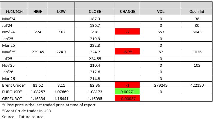 London was pretty busy and over 650 lots crossed the line for November 24. The majority of the volume was around the £222 mark but later in the day as Matif and Us continued to slide further into the red, Nov got down as low as £218 which is £7 off yesterday’s settlement. May 25 also slipped £6.75 and was trading @ 224.70 on the close.