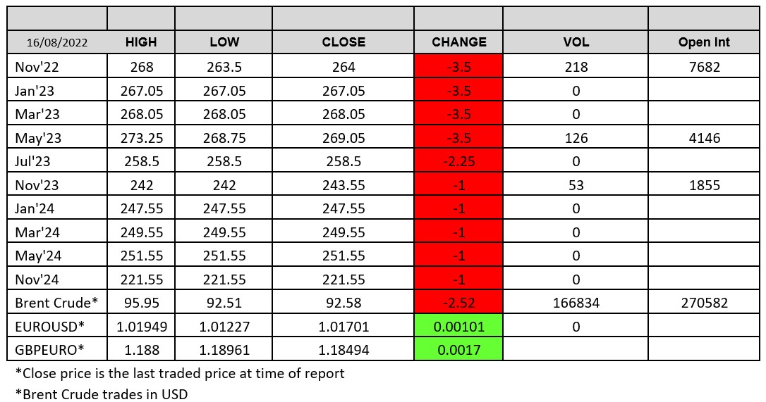 Wheat was lower both in the US and Europe with funds having paired back their positions. Russian wheat harvest passes the halfway point during the week to Aug 15th with 67.8Mmt in the bins. Russian wheat exports continue at below average pace, with Jul-Aug Russian wheat export estimate at only 5.8Mmt, -22% to average and -28% YOY despite record crop according to SovEcon. Need to crank it up to ensure volumes get out, trade seems to not be overly worried and anticipate exports to fire up more strongly. Iraq announced to the market a US only wheat tender and Jordon bought 60kt of wheat to be sourced from optional origins in an international tender which closed on Tuesday according to traders – $385.50/t c&f apparently. Matif Sep-22 wheat settled down €7.75 on yesterday at €332/t.