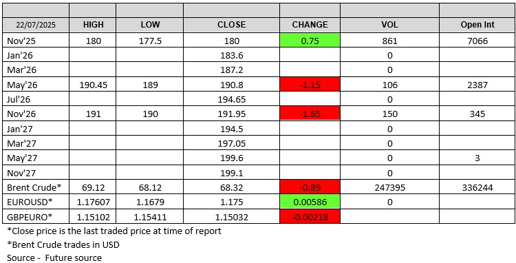 London wheat Nov26 saw a chunk of volume go through, 150 lots between 190/191. A good proportion of the 345 lots of OI. The Nov25/May26 spreads tightens 1.50, settling at -10.80 on the day.