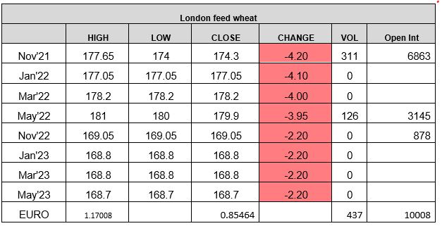 Corn down due to weak export sales and some rain forecast for the US Midwest weighing on prices. Germany’s barley crop is still expected to be larger than last year’s despite the heavy rain with 2021 harvest scheduled to rise to 9.3mt from 8.7mt. Strategie Grains cuts France’s soft wheat harvest to 37 – 37.5mt, down from 38mt forecast last week due to lower yields in Northeast. USDA Madrid has revised European grain production, increases outlook by 5% to 293.3mt from 279mt.
