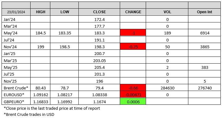 Another mixed day on the markets. London wheat finishes marginally lower with the rest of the grains marginally higher. Has the selling on Chicago dried up and we’ve found a near term low? Maybe we will see a correction at some stage, but there doesn’t seem to be any fundamental catalysts to bring about a bull market. Soybeans up and corn around unchanged, but both remain near multi year lows as the trade waits for further indications on South American crops after some improved weather. Although analysts cut forecasts for Brazil’s soybean and corn crops with the earlier drought, improved rainfall since last month could limit losses, while Argentina is on course for a bumper harvest. London Wheat’s May24/Nov24 spread trades out to -15.15. Is there scope for this to widen further? Some seem to think will need to widen to <-19 to incentivize wheat to be carried into the new season. Nov24/May25 trades at -7. |