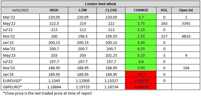 Wheat futures found support today on the Russia-Ukraine conflict fears with the potential impact of shipments in the region according to the trade. Media outlets pumping out conflict chatter continue to pump this sentiment. Traders are starting to add some risk premium with the threat of conflict rising. Algeria has issued a tender to purchase 50kt of milling wheat today. Algeria have also announced a targeted wheat harvest of 2.7Mmt in 2022 according to the Government, allowing Algeria to reduce wheat imports by 26%. Geopolitical chatter has the wheat bulls on the run today. Market reactions for wheat will very much depend on what happens, whether a political deal is confirmed. Wheat has also seen a pickup in fund interest on the buy side. Matif Mar-22 wheat settled up €8.50 on Friday at €281/t. London wheat followed global markets higher.