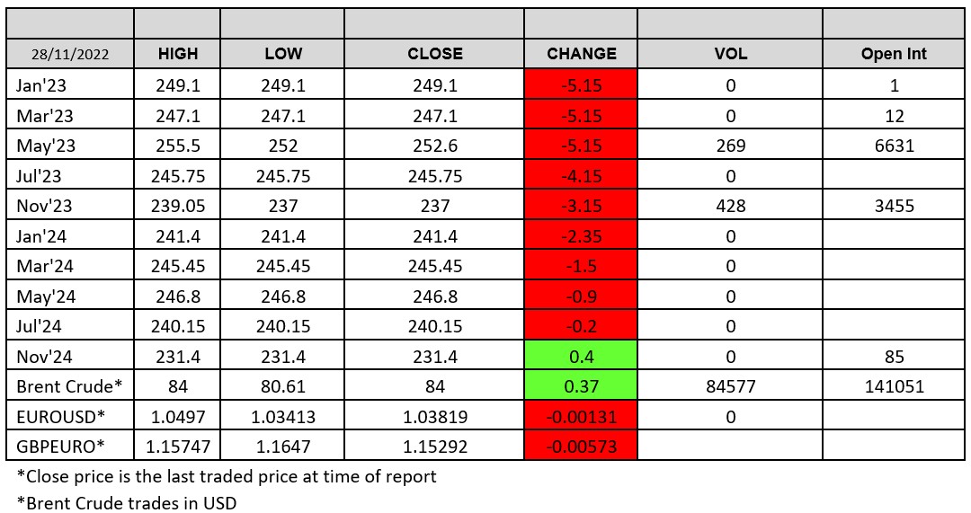 Weekend news focuses on the continued increase in Chinese covid cases hitting fresh highs on a daily basis and supposed growing civil unrest against the Chinese government. Lockdowns are now starting to weigh serious questions on the Chinese economy, especially in the coming months if they cannot be rectified. Around the equivalent of 20% of GDP are either in partial or complete lockdown. Following this, equity markets and commodities dropped on the open this morning although Brent, which was trading down circa 3% at one point, hitting $80.61/ba was trading only 0.3% down at 83.25/ba at time of writing as new sources have said that OPEC are now looking at cutting production at last week’s meeting. How true this is, is up for debate.