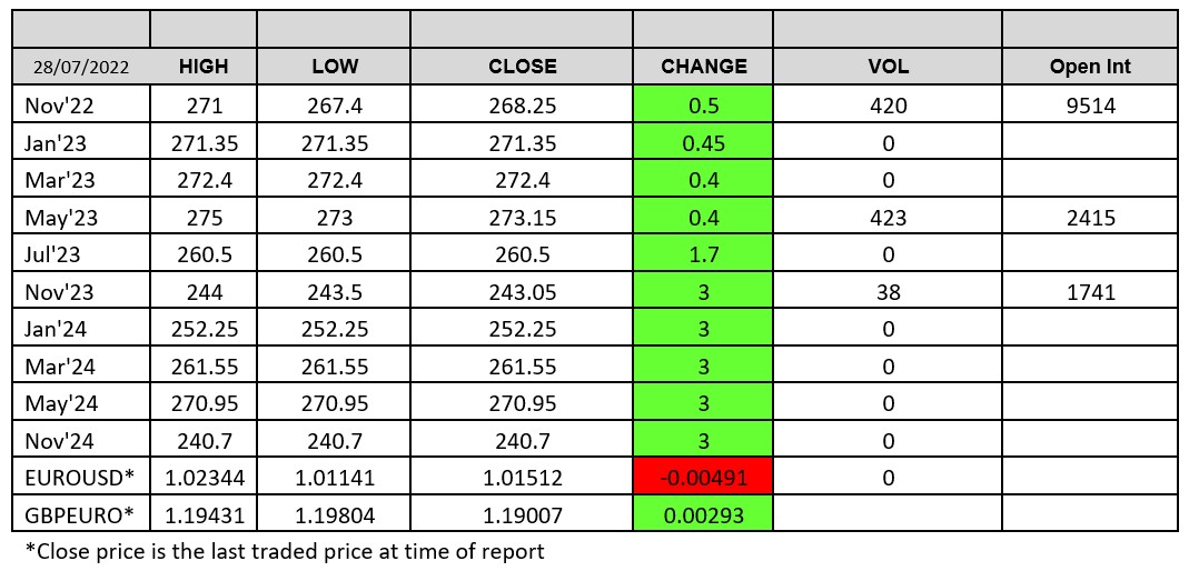 London wheat trades decent volumes today (881 lots across the curve), after posting reasonable gains soon after the Chicago markets opened for the main session, things calmed down into the close settling marginally higher on the day.