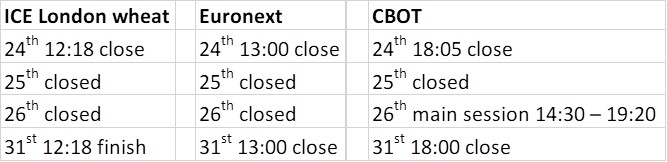 London Wheat closes early tomorrow, with the contract closing at 12:18 UK time. The other markets are open as normal.