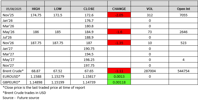 London wheat came off once again, with the Nov-25 contract trading down £2.05 on the day. Both May-26 and Nov-26 also saw red on the screen, with all contracts following Matif and Chicago wheat contracts further down under strong harvest pressure in the northern hemisphere.