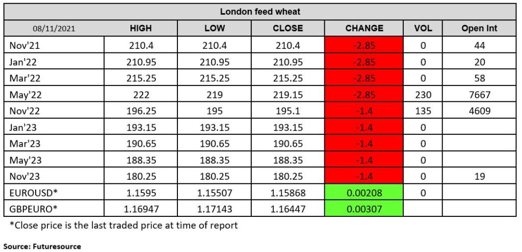 London wheat futures followed Paris lower in today’s trading. Prices are still strong and are reflective of current global trends and UK tightness. Feed barley is continuing to track feed wheat higher with Nov-21 delivered into East Anglia at £205/t (AHBD), £13.50/t below feed wheat. Fertiliser purchasing by UK arable farmers has remained strong. The demand destruction from less winter wheat/OSR that some were expecting has not materialized to a full extent with the Livestock/Grassland boys taking the bear of the brunt (ADM Agri).