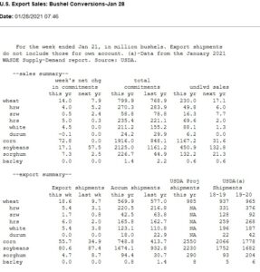 Wheat futures traded lower. WH closed near 6.47. Range was 6.43-6.64. Lower soybean and fact corn traded off its highs weighed on wheat futures. KWH traded near 6.26. Range was 6.24-6.45. Concern that vaccine rollout was slower than hoped raised concern about delay in US economic recovery. US Fed comments that US economy was moderating also raised concern that restrictions on travel could slow consumer spending. US wheat export sales were 380 mt versus 250-600 expected. Total commit is near 15.5 mmt versus 15.7 last year. USDA goal is 26.8 mmt versus 26.2 last year. Key could be Russia exports. There is talk that Russia, EU and Argentina is looking at options to secure domestic wheat supplies short of export quotas. Argentina could soon increase wheat and corn export tax from 12 pct to 20 pct.