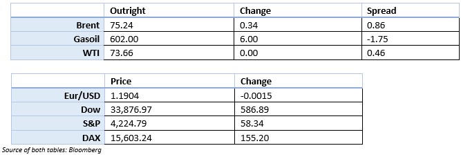 - Bullish stance continues as Brent hits $75 for the first time in two years. Backwardated curve in crude continues to support this upward move