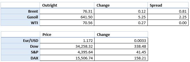 - US stock data showed crude inventories falling for the seventh week running. This is not totally unexpected as production in the gulf of Mexico in the wake of hurricane Ida has been restricted and only 80% back on line.