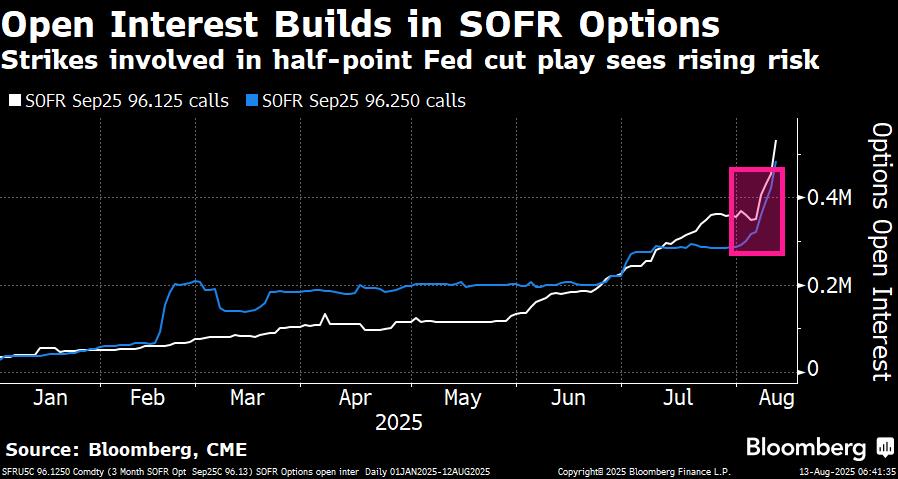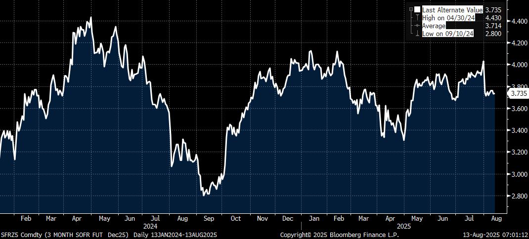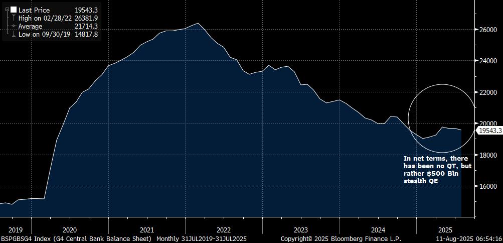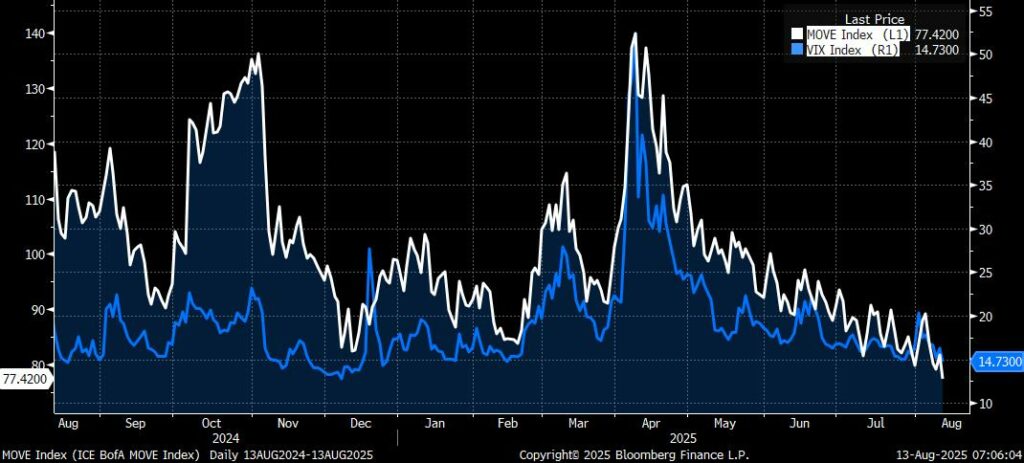 Yesterday’s US CPI has been construed as confirming the likelihood of a Fed rate cut in September, and yet core CPI was slightly above expectations 0.3% m/m and a very lofty 3.1% y/y (relative to target). While good price inflation remained relatively subdued, which some will interpret as signalling a modest impact from tariffs, it remains the case that the impact of tariffs, which has been persistently delayed, will only start to meaningfully show up in coming months. Rather more worryingly, especially for the likes of the dissenting Waller (Bowman’s case appears to rest far more on the labour data – i.e. the data for which the head of the BLS was ‘fired’) is the upturn in Services CPI (0.3% m/m 3.8% y/y), above all ex-Housing at 0.5% m/m. To be sure Airfares (4.0% m/m) had a sharp impact, but as the attached chart highlights, the seasonal trend is running a good deal higher than in 2024, and it would be disingenuous to suggest that it is consistent with core CPI converging to the Fed’s 2.0% target. Be that as it may, risk assets, above all equities, celebrated this with a move to new highs in many cases. The latter is being given extra rocket fuel by speculation about a potential 50 bps rate cut in September, presumably partially rationalised by Miran’s temporary appointment to the FOMC. The case against 50 bps primarily boils down to last year’s 50 bps cut having been a mistake, above all due to FOMC members over-interpreting the transient weakness in labour demand last summer (sic! Ed.), which one might add probably contributed to the extended pause in rate cuts this year.  Be that as it may, the other key drivers of the current rally, aside from Q2 earnings (above all Mag 7) is very subdued interest rate volatility. As can be seen both in the chart of the narrow range in which the Dec 2025 SOFR future has traded over recent months, and over the year to date as a whole compared to the 2024 rate expectations roller coaster, and the very low level of the MOVE Treasury volatility index, which is in turn helping to keep the VIX subdued. Of course what is missing from this rationale is any discussion of tariffs, geopolitical tensions, uncertainty, policy ambiguity, or political interference in monetary policy, which fits with markets whose reaction function has been severely impaired (above all by QE liquidity, which has not risen this year despite QT programmes), and is largely reliant on momentum trades, with the derivatives tail very much ‘wagging the dog’. This is a classic example of a perception vs. reality divide that has a tendency to unravel in a disorderly fashion, though the degree generally varies according to happenstance, the worst example being the GFC.