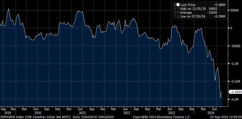 – CPI has largely surprised on the downside for much of this year, allowing the BoC to cut rates twice, and signal more to come in the face of a weaker economic outlook. July CPI is expected to reinforce that view, with a seasonally typical 0.4% m/m rebound in headline set to bring the y/y rate down to 2.5% from 2.7%, while Median and Trimmed Mean core measures are both forecast to edge down 0.1 ppt to 2.5% and 2.8% y/y respectively. Still it is worth noting that a meaningful upside surprise might trigger some CAD short covering given the outsized IMM non-commercial net short position (see chart).