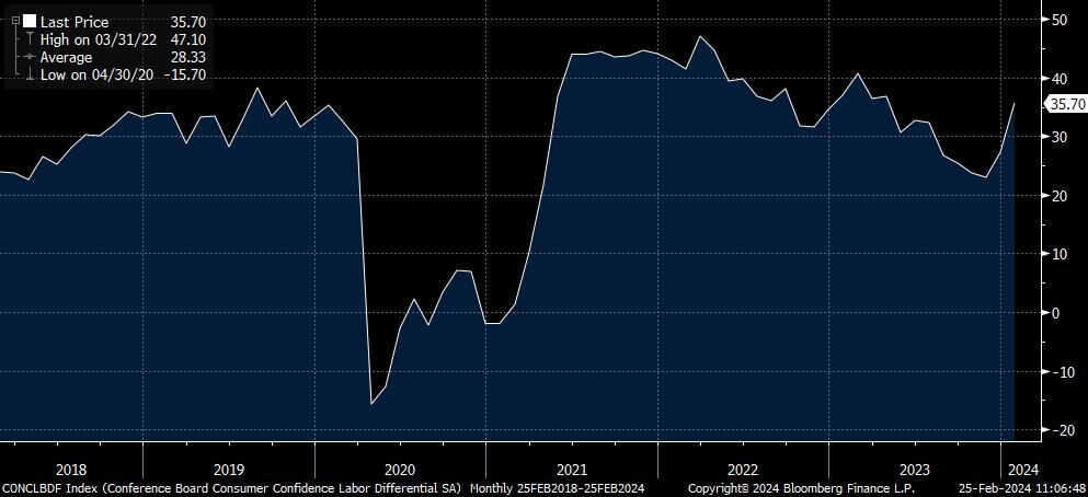 Statistically, the focal point for the US will be Friday’s PCE deflators, that are expected to echo CPI with increases of 0.3% m/m headline and 0.4% m/m on core, which thanks to base effects will still see y/y rates to fall to 2.4% and 2.8% respectively, and likely to continue to head slowly lower in coming months, even if 3 6-mth annualized rates tick higher short-term, and leaving the door open to an initial rate cut in June. New Home Sales get the week underway, and are seen up a further 3.0% m/m following December’s 8.0% rebound, with Pending Home Sales later in the week also expected to post a gain of 1.1%, while FHFA and CS CoreLogic House Prices (for December) are seen up 0.3% and 0.2% m/m to push the latter’s y/y rate up to 6.0%, remarkable given the rise in mortgage rates. Consumer Confidence on Tuesday is seen edging up to 115.0 after January’s unexpectedly strong rise to 114.8 from 108.0, with robust labour demand underpinning the current strength, as was so evident in January’s sharp Labour Differential rebound (see chart). Headline Durable Goods Orders are forecast to take a big hit (exp. -5.0% m/m) from very weak Boeing orders, but are seen up 0.2% m/m ex-Transport and 0.1% m/m on the core Non-defence Capital Goods ex-Aircraft metric. The first revision to Q4 GDP is expected to show headline unchanged at a robust 3.3% SAAR, but Personal Consumption shaded 0.1 ppt lower to 2.7%, but this is now very historical. The advance Goods Trade Balance, Dallas, KC and Richmond Fed and final Michigan Sentiment surveys are also tabled for release.
